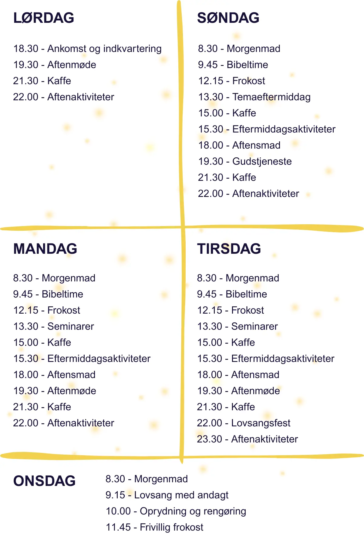 Nedenfor kan du se det foreløbige program for Discipeltræf 2025. I løbet af de kommende uger løfter vi mere af sløret for, hvilke lækre/sjove/fede/lærerige ting, lejren kommer til at indeholde i år.